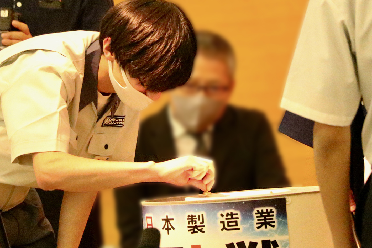 6月18日、桐生商工会議所ケービックホールにて「全日本実業団コマ大戦桐生場所」が開催され、全24チームが参加しました。直径20mm以下、全長60mm以下のコマを片手で投げ、回転時間を競い合う競技で、相手を土俵外へ出しても勝ちとなります。当社メンバーは技術一部の茂木大地さん・伊藤涼介さん・櫻井太智さん、一般クラッチ品質保証部の関口昌利さんが選手として参加しました。製作は一般クラッチ生産技術部の阿部伸一さんにお願いし、私は参加責任者を仰せ付かり、コマ名称は参加した皆さんの頭文字よりMANSSI君と名付け、申込みを行いました。